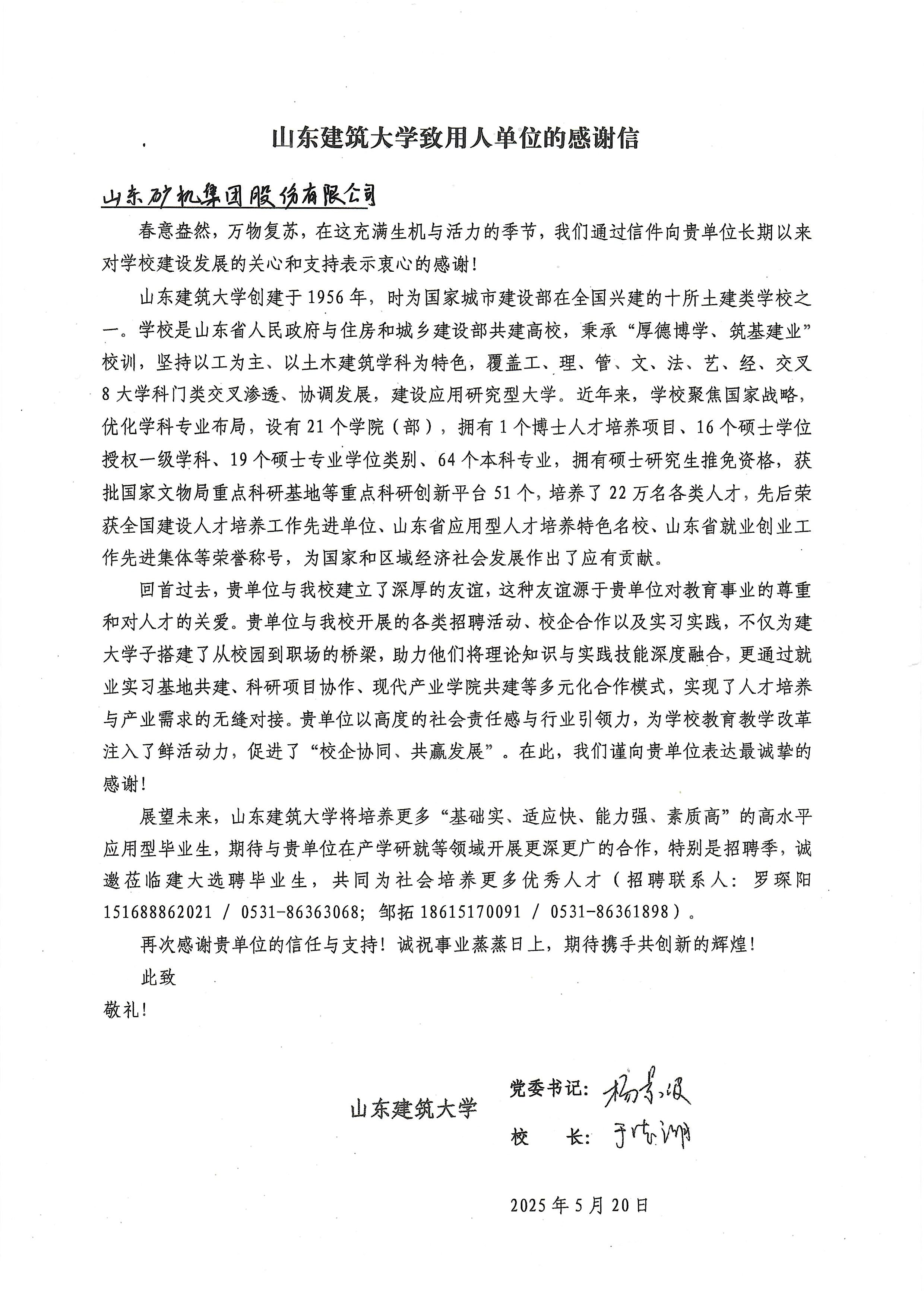 近日,山東礦機集團股份有限公司收到山東建筑大學發來的感謝信,...